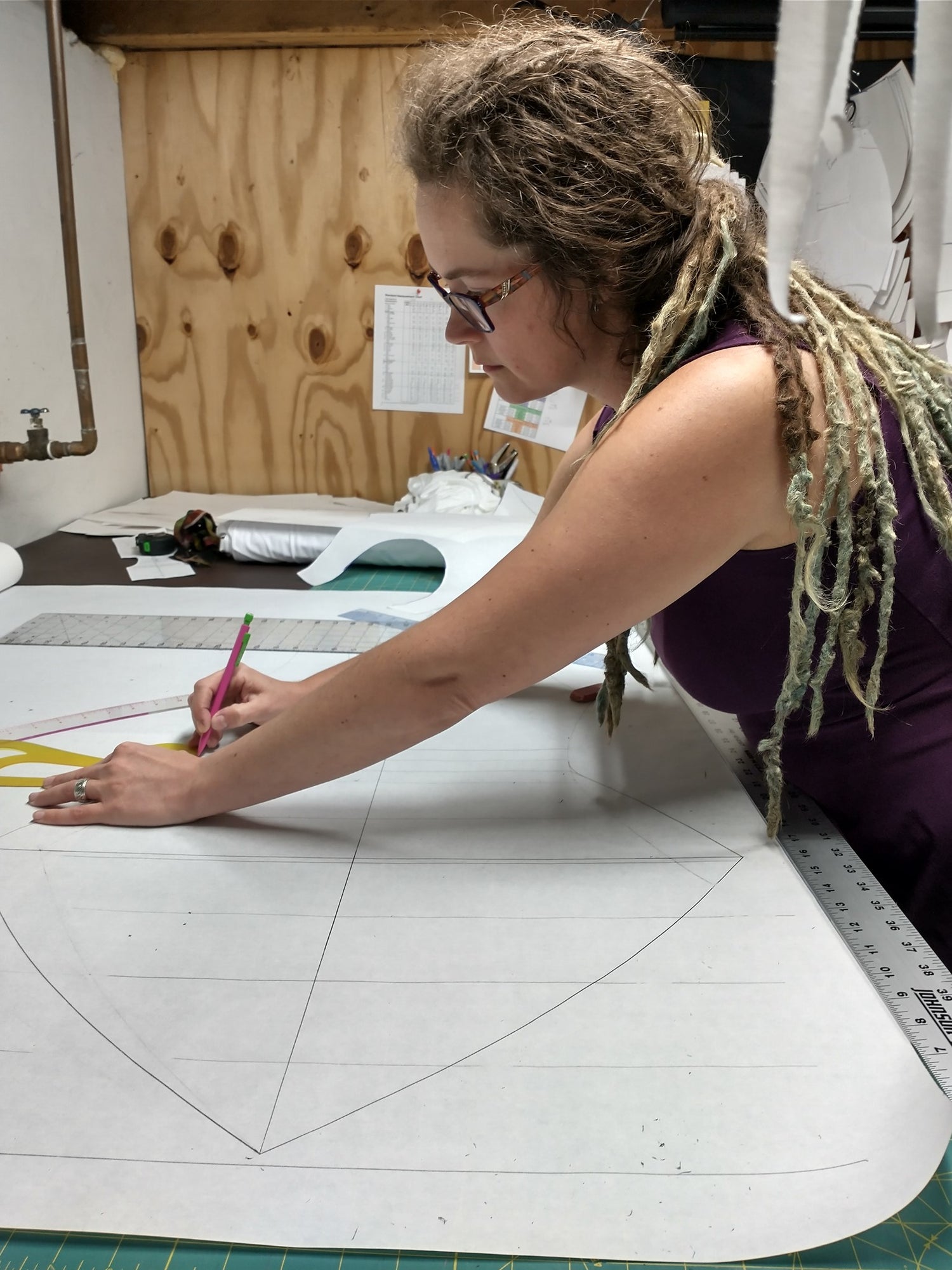 All items are designed and patterned by me the old school way, with paper, pencil, french curves, rulers, and my hands. Drafting and grading patterns (making different sizes) focuses my mind and is so calming to my soul.