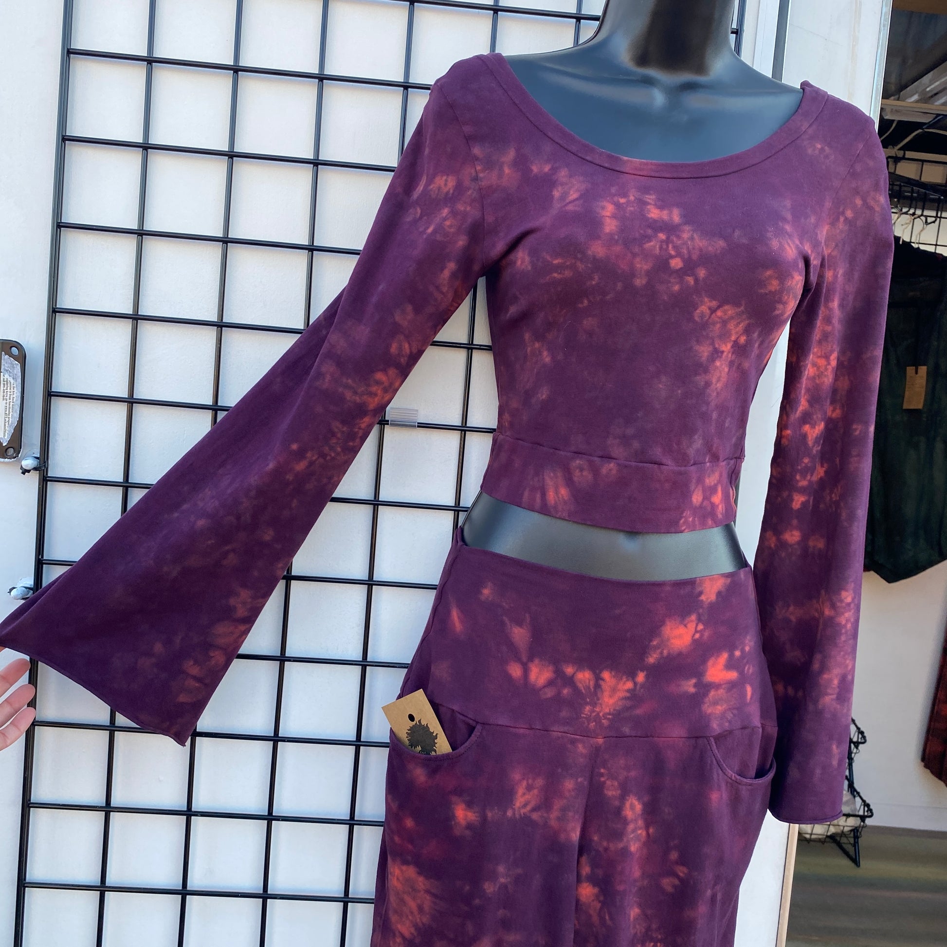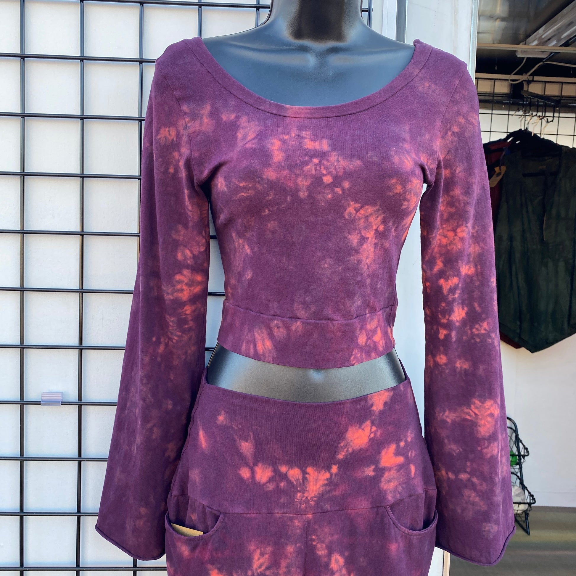 1 of 1 crop made from salvaged orange stretch cotton over dyed with dark purple. Best fits small - medium.