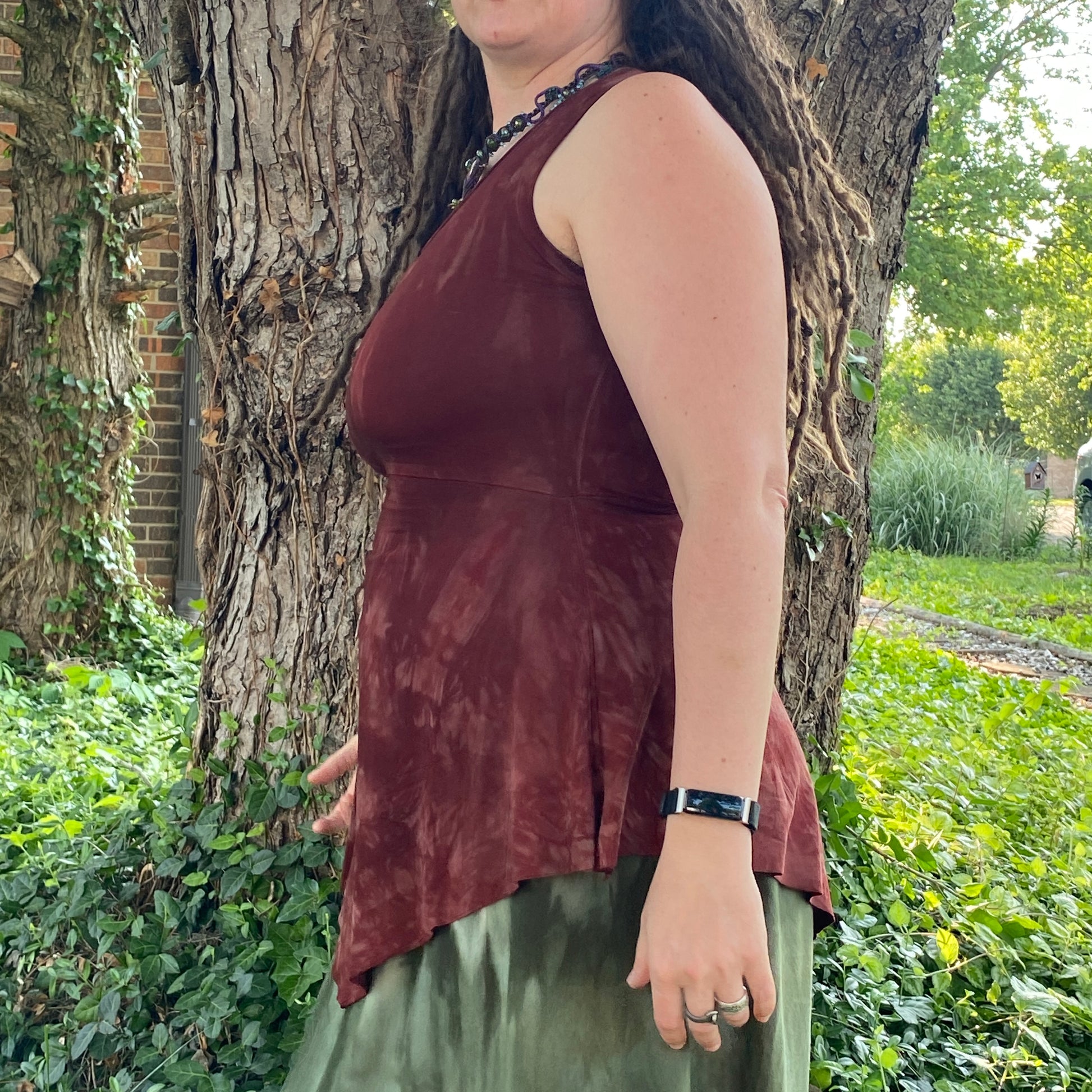 Our organic cotton/ bamboo/ spandex jersey fabric is oh so soft, super stretchy, and accommodating. This allows us to create a size chart with a little wiggle room for bodies that change shape from time to time. In general, you will want to order a size where your body would be in the middle of the range.
